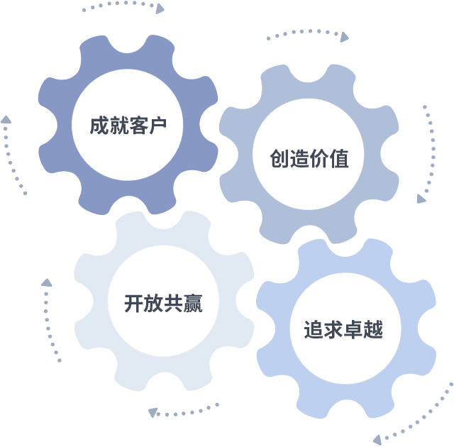 成就客户是一切决策的出发点,,,,创造价值是衡量所有工作的标准,,,追求卓越是人生就是搏做事做人的态度,,,,开放共赢是人生就是搏的格局也是最终的结果。。。。价值观的齿轮环环相扣,,推动着组织里的每个人不断向前。。